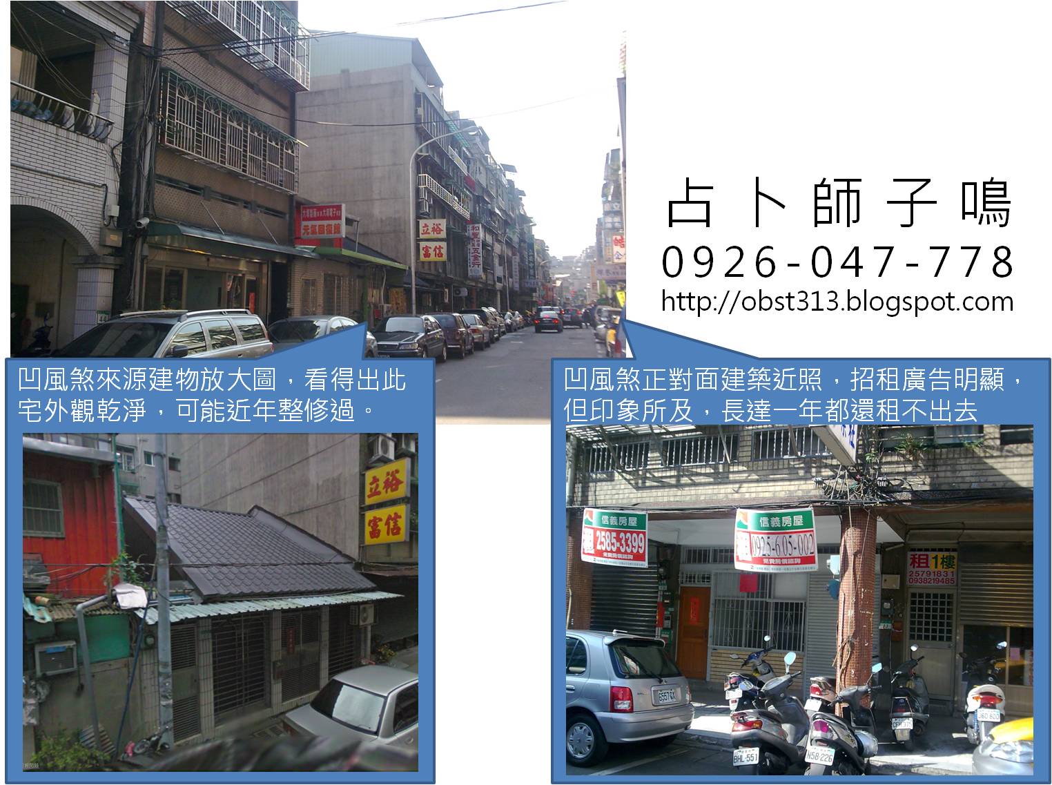 下面這張圖,右邊低矮那棟就是煞氣源,一看就知道屋主經濟力不好,但仔細看一下,左邊的建築物卻也被干擾到了,之前店面的招牌都還沒收掉呢,此宅就我所知,一樓是當了倉庫在用,其他樓層則是長期有屋出租,卻乏人問津。