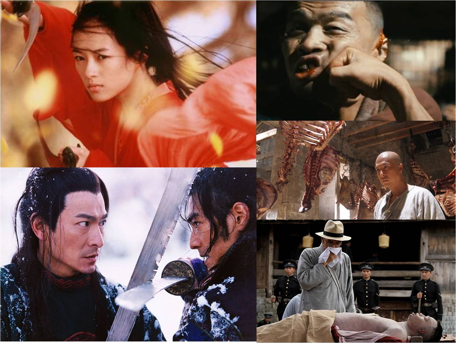 我刻意抓幾張圖湊在一起,左邊是張藝謀導的英雄跟十面埋伏,右邊是武俠,可以看到陳可辛試著把比較真實污穢的那面展現出來,也許是為了方便觀眾聯想,劇中陳可辛還故意選了屠宰場,當唐龍醒悟之地,一個武功高手,所過的日子,其實就是跟屠夫沒有兩樣,如果你連去傳統市場跟肉販買肉都會嫌臭怕髒,那應該可以進一步想到:要在江湖上混,天天面對血腥,那可不是件人人都做得來的事。